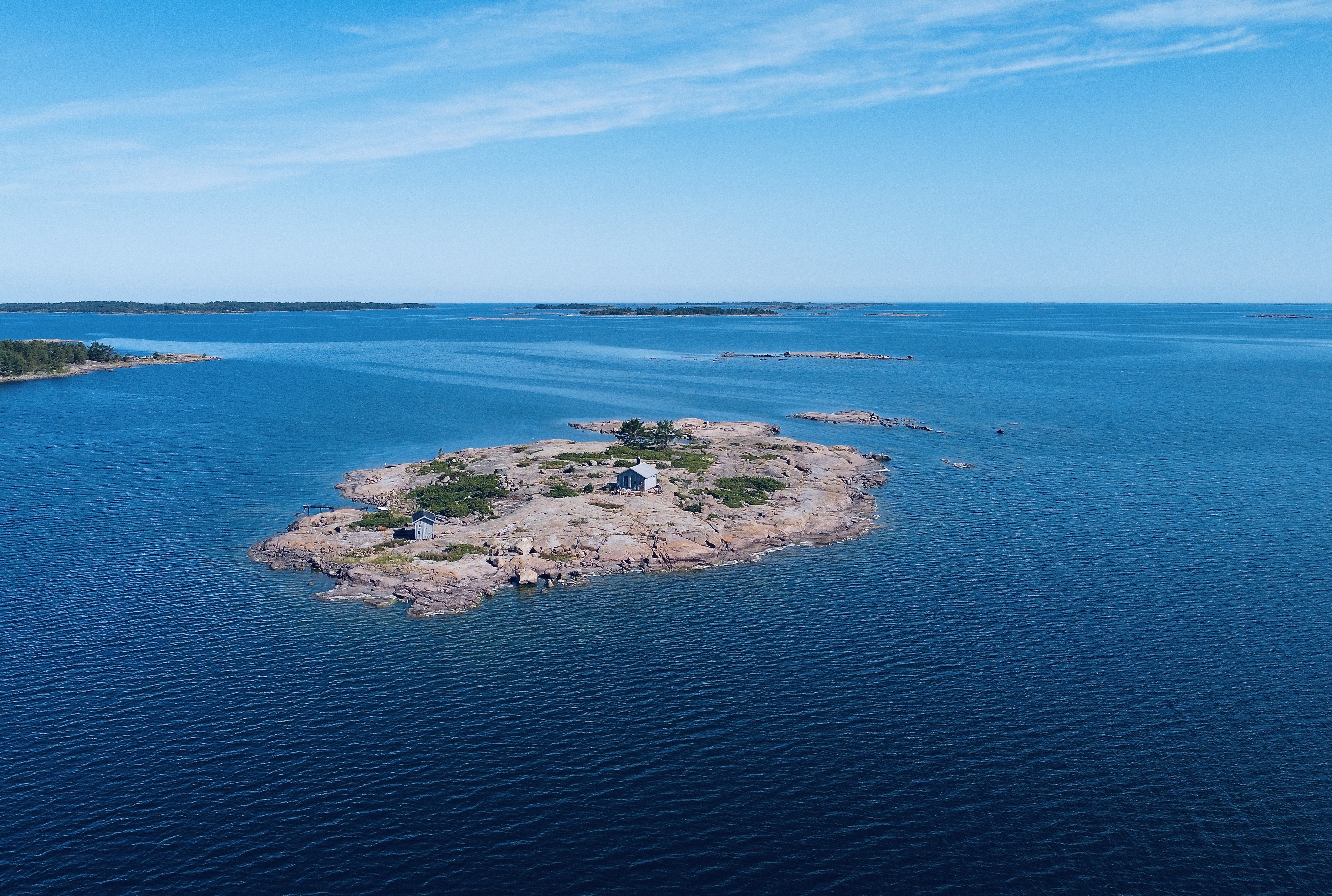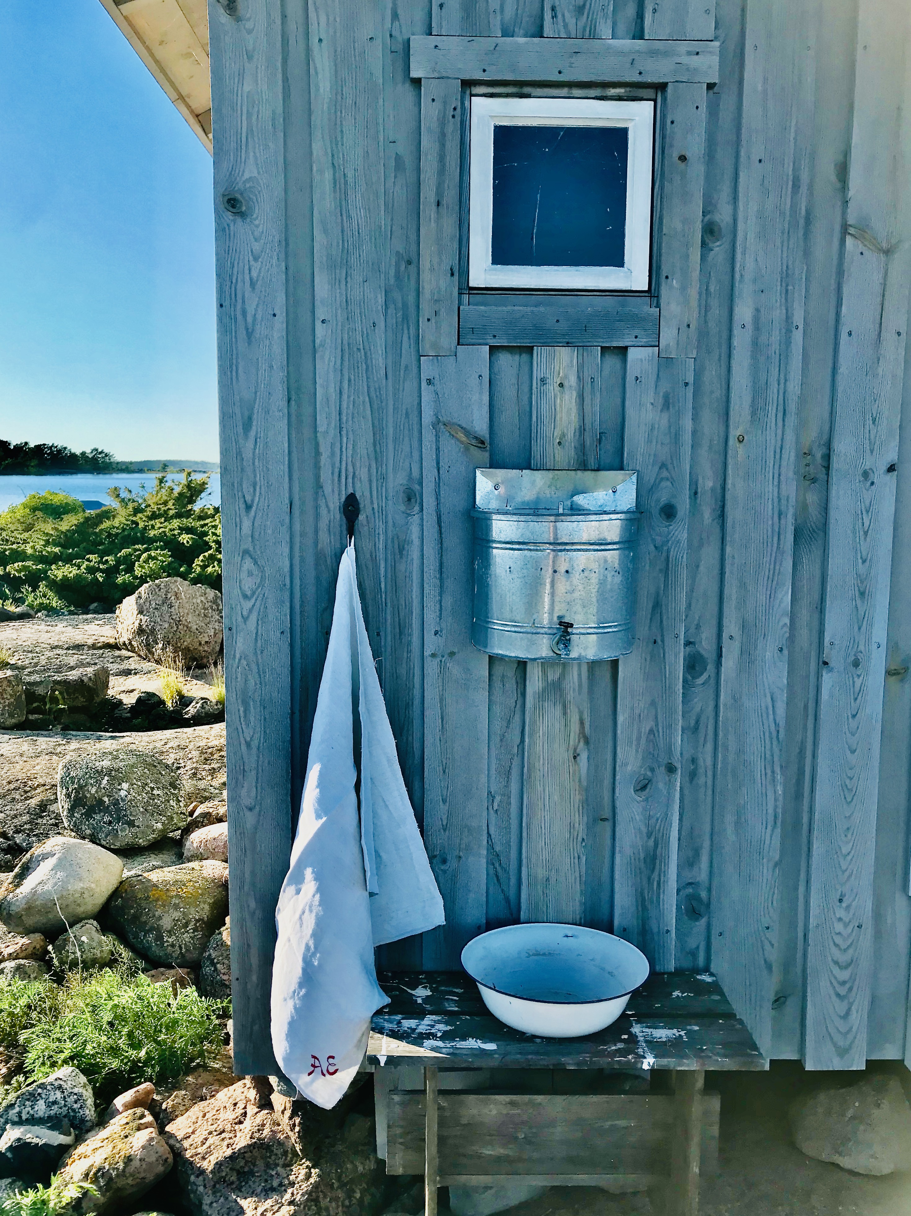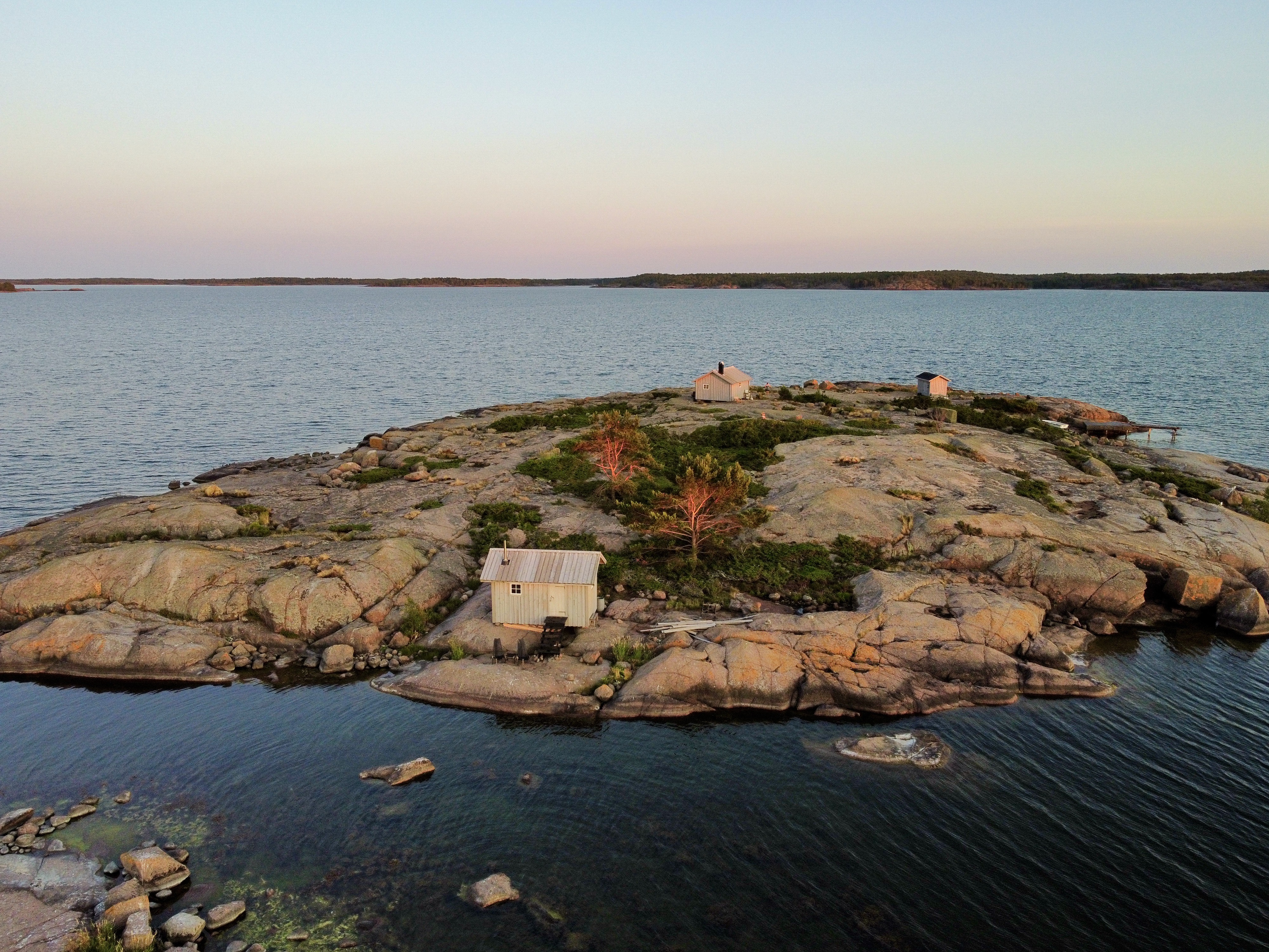 Alla byggnader är tillverkade i gammal stil med naturliga material och har många fina detaljer i smide. Huvudbyggnaden består av ett allrum med kök, matbord och kamin. I ena ändan finns en platsbyggd våningsäng med draperi om man vill stänga till sig. Förvaring finns i form av ett gammalt militärskåp och lådor under sängen . En bit bort på norra sidan av ön ligger bastubyggnaden med kammare. Här kan man hoppa rakt ner i havet om man känner för att svalka sig efter bastun! Utedasset ligger nedför berget i samma byggnad som förrådet.